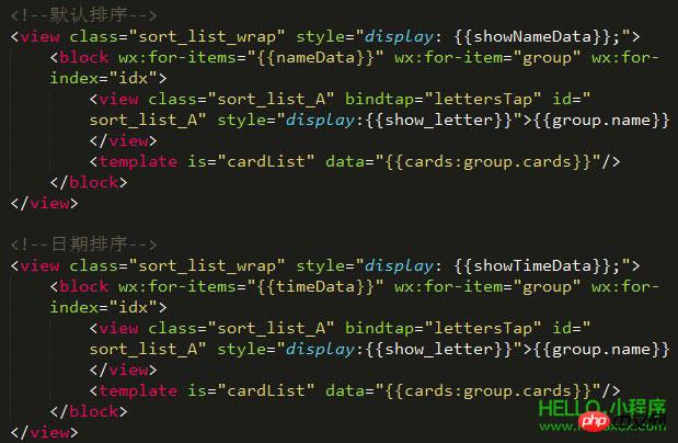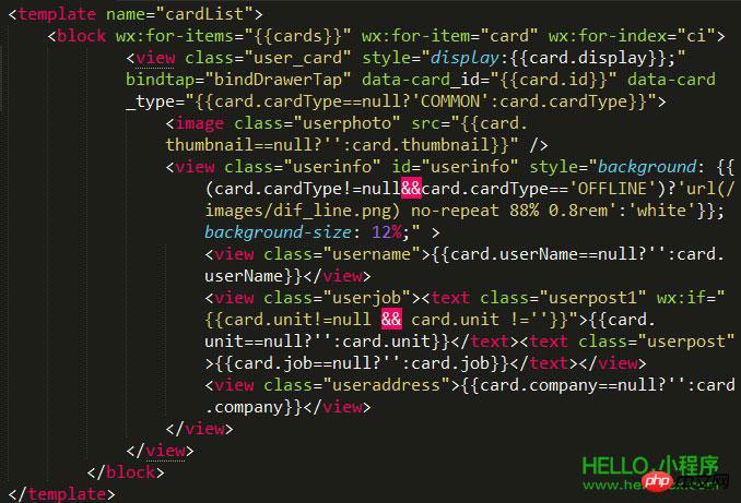 名片夹:由于该项目主打名片功能,故很多地方使用,所以需要把名片以 template 分离出来。 Template:定义一个模板,name 模板的名字其实是个作用域。 Block:循环控制,名片很多,必须用循环出来,和很多操作数据的前端框架循环差不多。 支持自定义属性 data,这里用作判断线上名片以及线下名片。 View 里面是一些数据引入,里面是支持三目运算符。