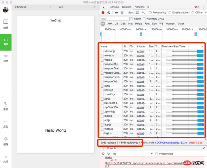 在调试工具的Network选项卡中,我们看到运行时加载了1000多个文件,总数据量1.8MB,而我们仅仅是在代码中加载了一个lodash库而已!这是因为微信小程序开发工具会将所有项目下的js文件视为项目文件,并进行打包。而实际开发中,我们需要安装很多的NPM扩展库,而这些扩展库中有大量的不需要打包的文件,例如lodash中有上千文件,而我们只需要用到其中的非常少的一部分。