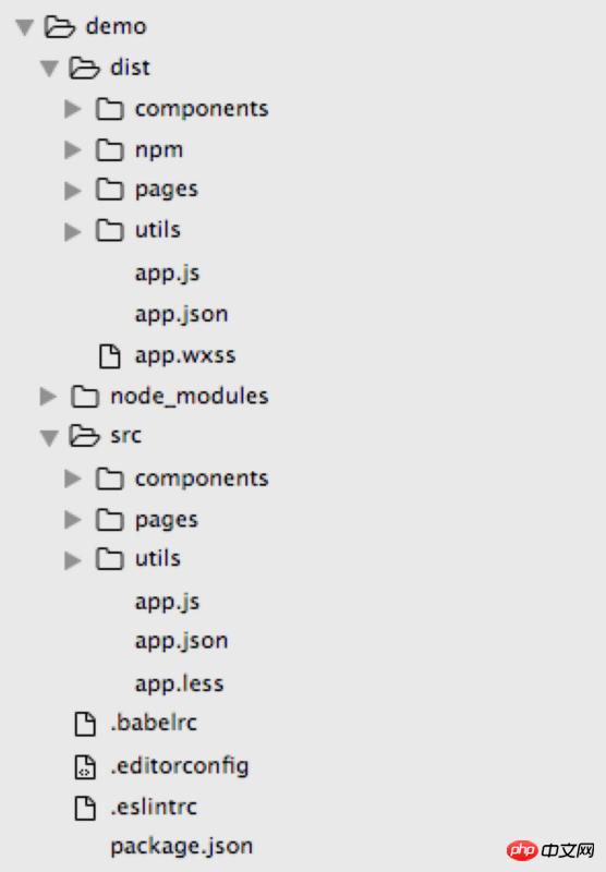 图中的src是我们的源码目录,node_modules是NPM包目录,dist是目标输出目录。请在开发者工具中新建一个项目,并设置路径到dist目录,请勿设置为demo目录!使用WebStorm或Sublime打开demo目录,开发过程中,我们使用WebStorm或Sublime修改src目录下的源码,请勿直接修改dist目录中的文件,因为dist目录是通过labrador命令生成的。