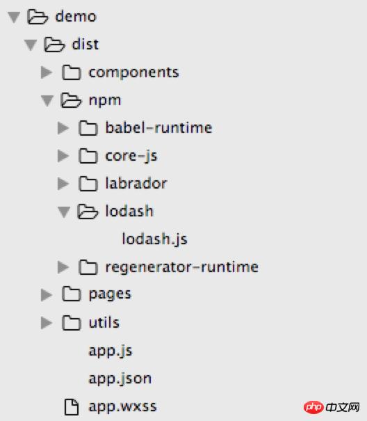 我们看一下dist/app.js的源码,发现源码中const _ = require('lodash'); 被编译为 var _ = require('./npm/lodash/lodash.js'); 然后labrador命令将node_modules/lodash/lodash.js 文件复制到了 dist/npm/lodash/lodash.js 。这就是通过labrador可以调用NPM包的原理。