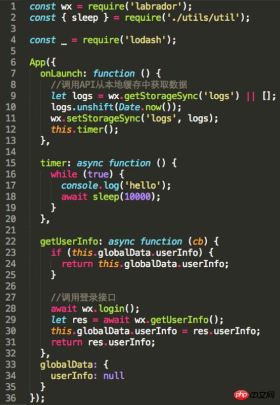 图中timer和getUserInfo属性都为async函数,函数体内使用await调用异步操作。labrador 库对微信API进行了封装,使用 const wx = require('labrador'); 覆盖默认的全局变量wx; 封装后的wx对象提供的异步方法返回的都是Promise异步对象,结合async/await函数彻底终结callback,将异步代码同步写,轻松逃离回调地狱!