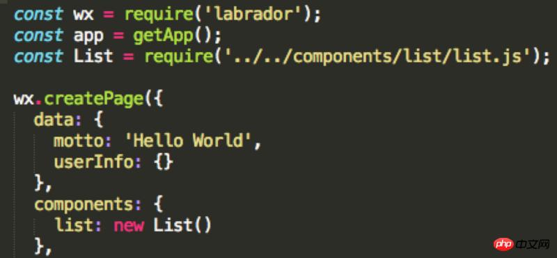 代码中首先引入了labrador库替换全局的默认wx对象,并使用labrador.createPage方法代替全局的Page函数声明页面。然后加载List组件类,在页面声明配置中,增加了components属性,并将List组件类实例化传入。labrador.createPage方法是对Page方法的一层封装,目的是在页面初始化时和组件对象进行关联。