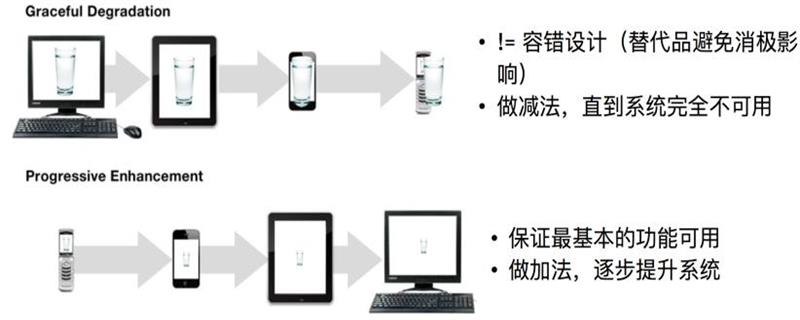 优雅降级(Graceful Degradation):一开始就构建站点的完整功能,然后针对浏览器测试和修复。比如一开始使用 CSS3 的特性构建了一个应用,然后逐步针对各大浏览器进行 hack 使其可以在低版本浏览器上正常浏览。
