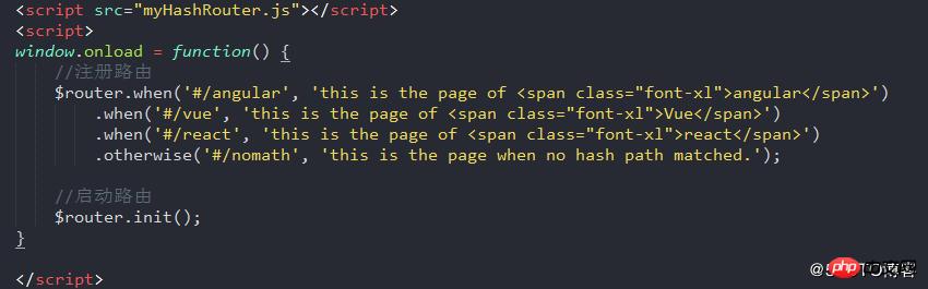 })();完成了路由插件的编写后,我们在demo中引入该库,然后使用when()方法注册几个路由地址,再使用init()方法启动路由,脚本部分代码如下: