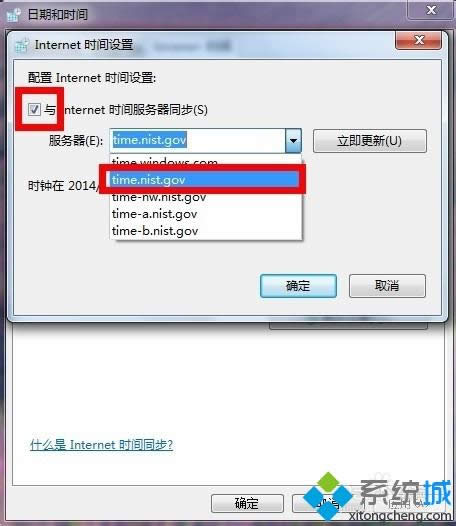 6、在internet时间设置页面勾选复选框”与internet时间服务器同步“,同时选择时间服务器”time.nist.gov“。本人测试这个服务器更新最快不会出错;