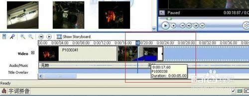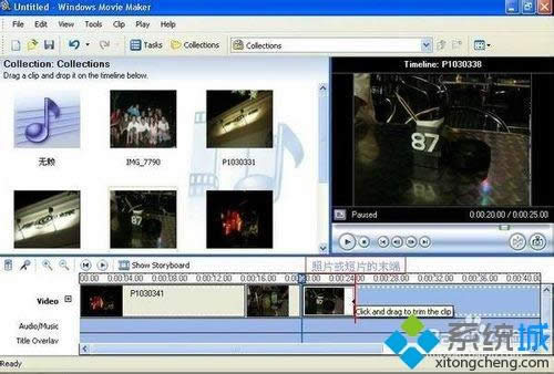 4、用滑鼠指在照片或短片的末端,就会出现(click and drag to trim the clip)